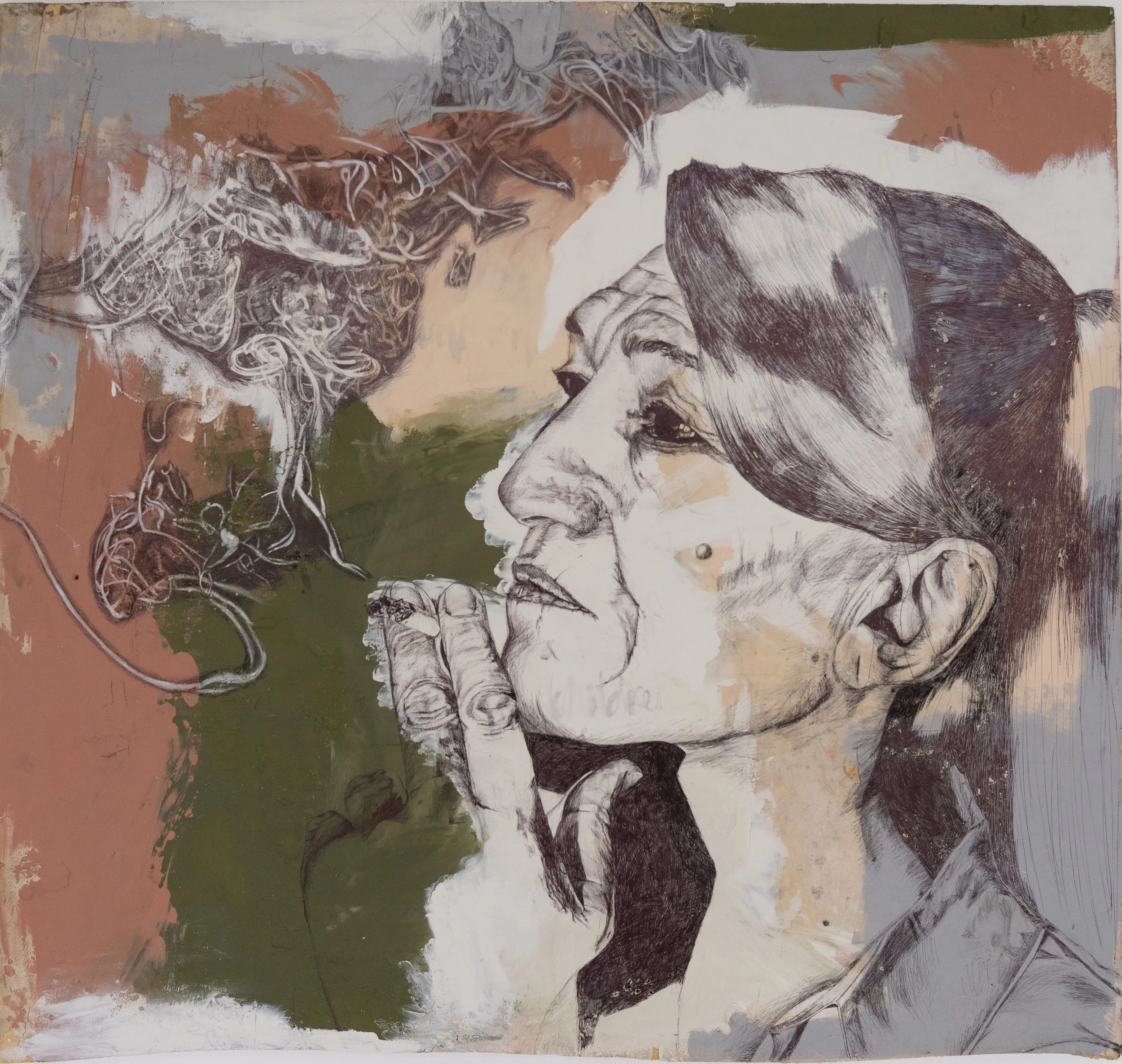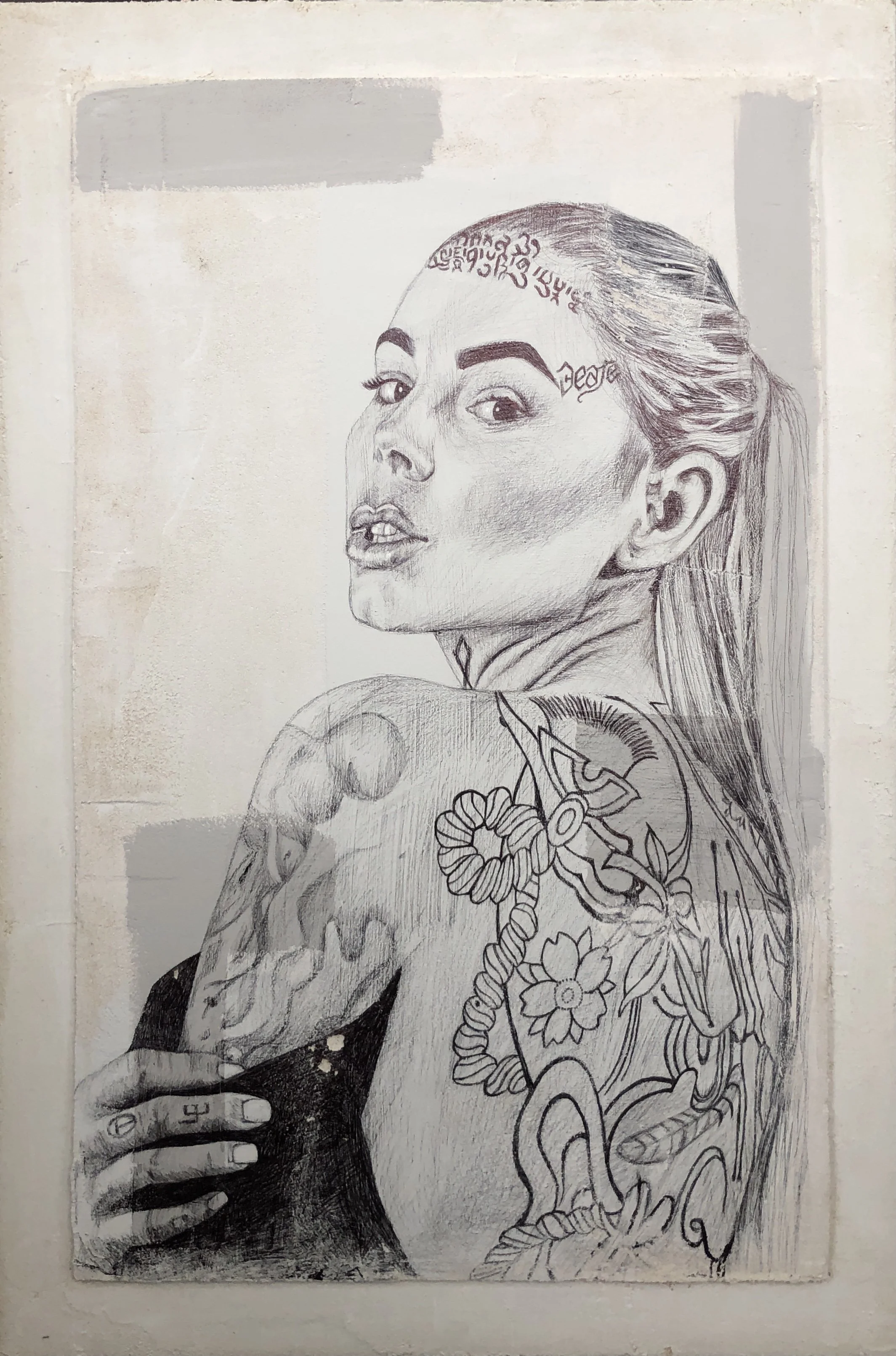 “Self Portrait” Biro and emulsion on cement. 120 × 150cm. 2023