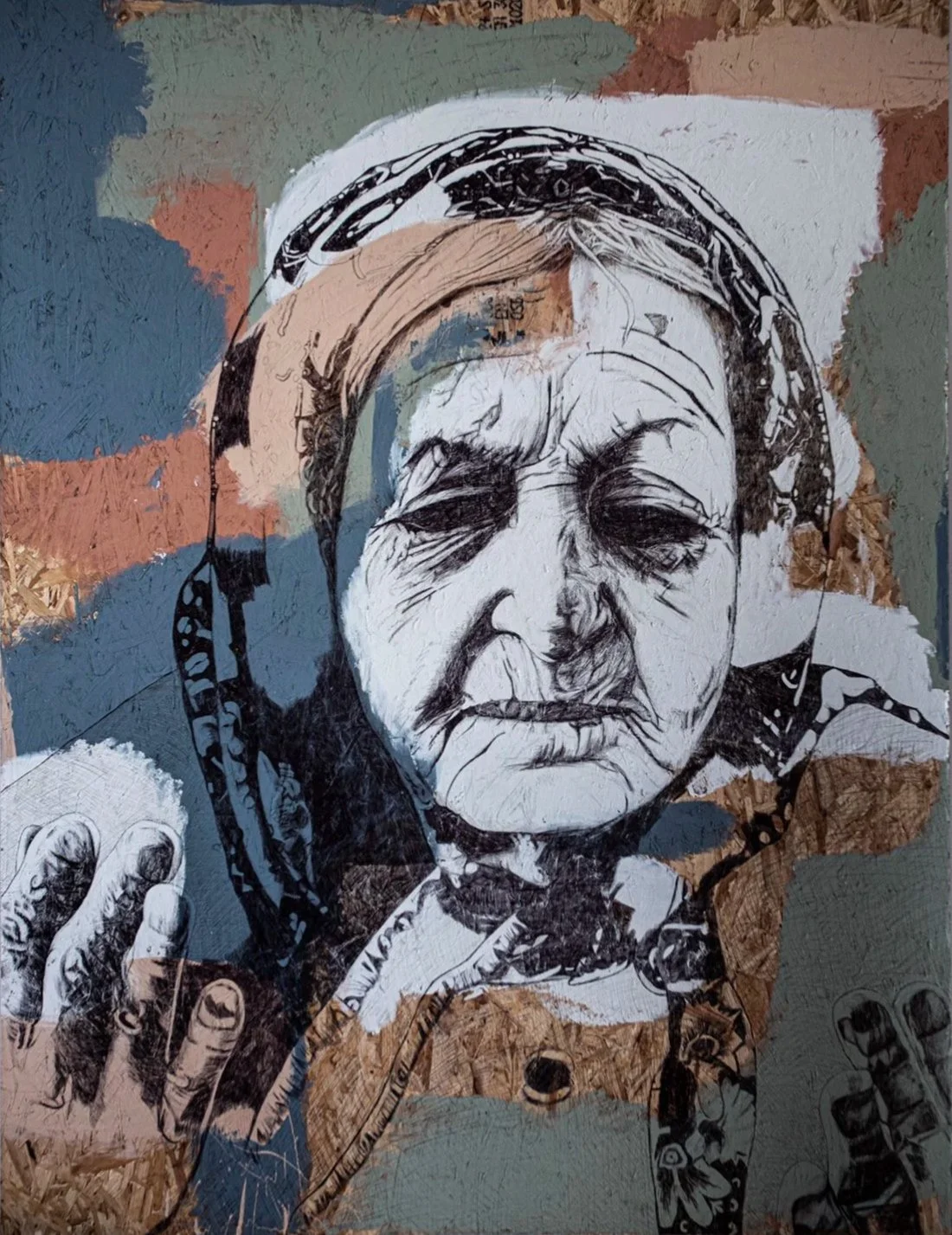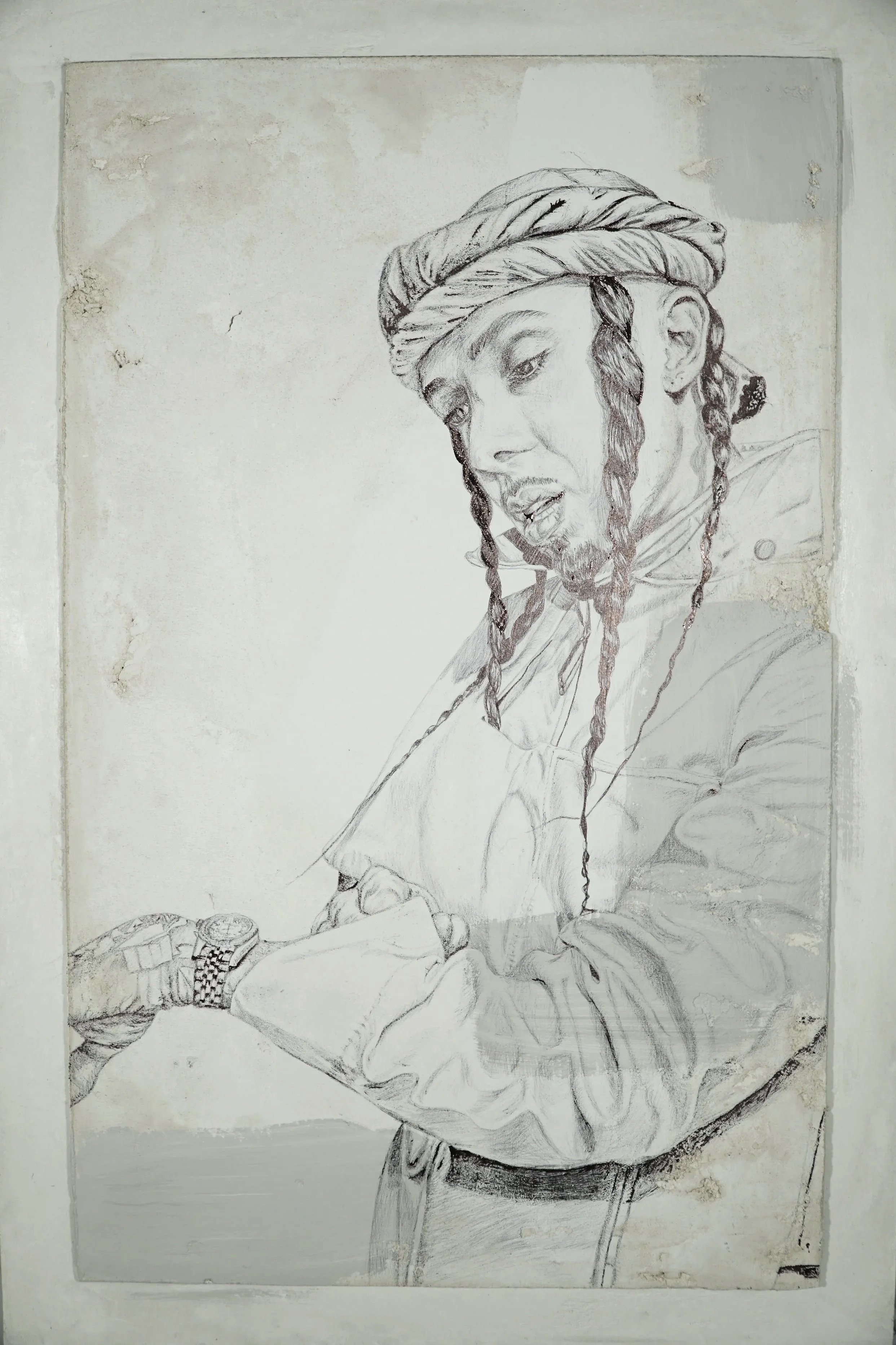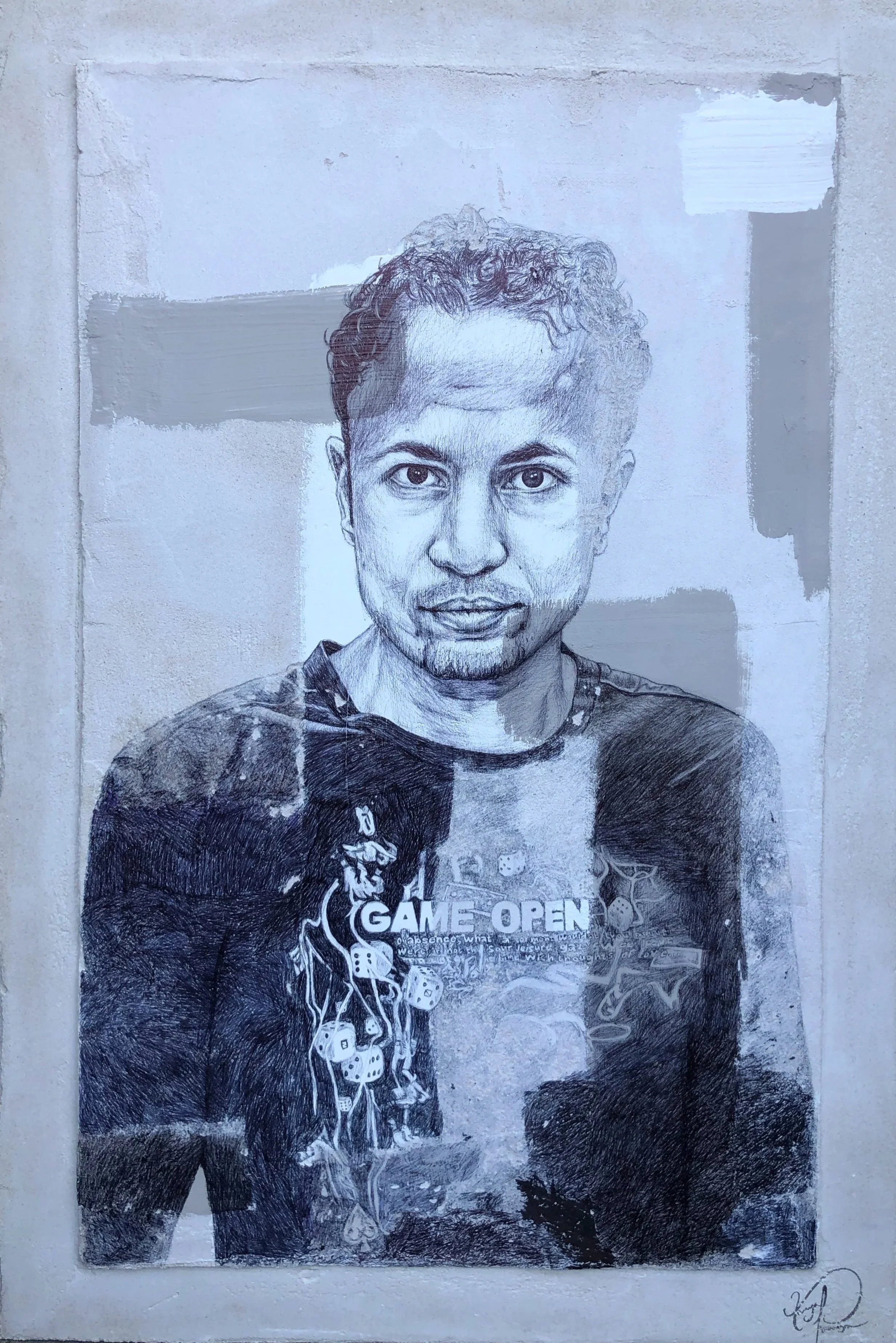 “Ahmad” Biro and emulsion on cement. 54 × 82cm. 2023