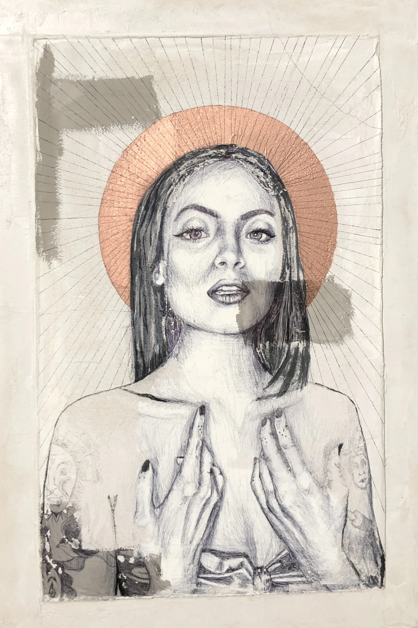 “Silent Prayer” Biro and emulsion on chipboard. 122 × 160cm. 2021