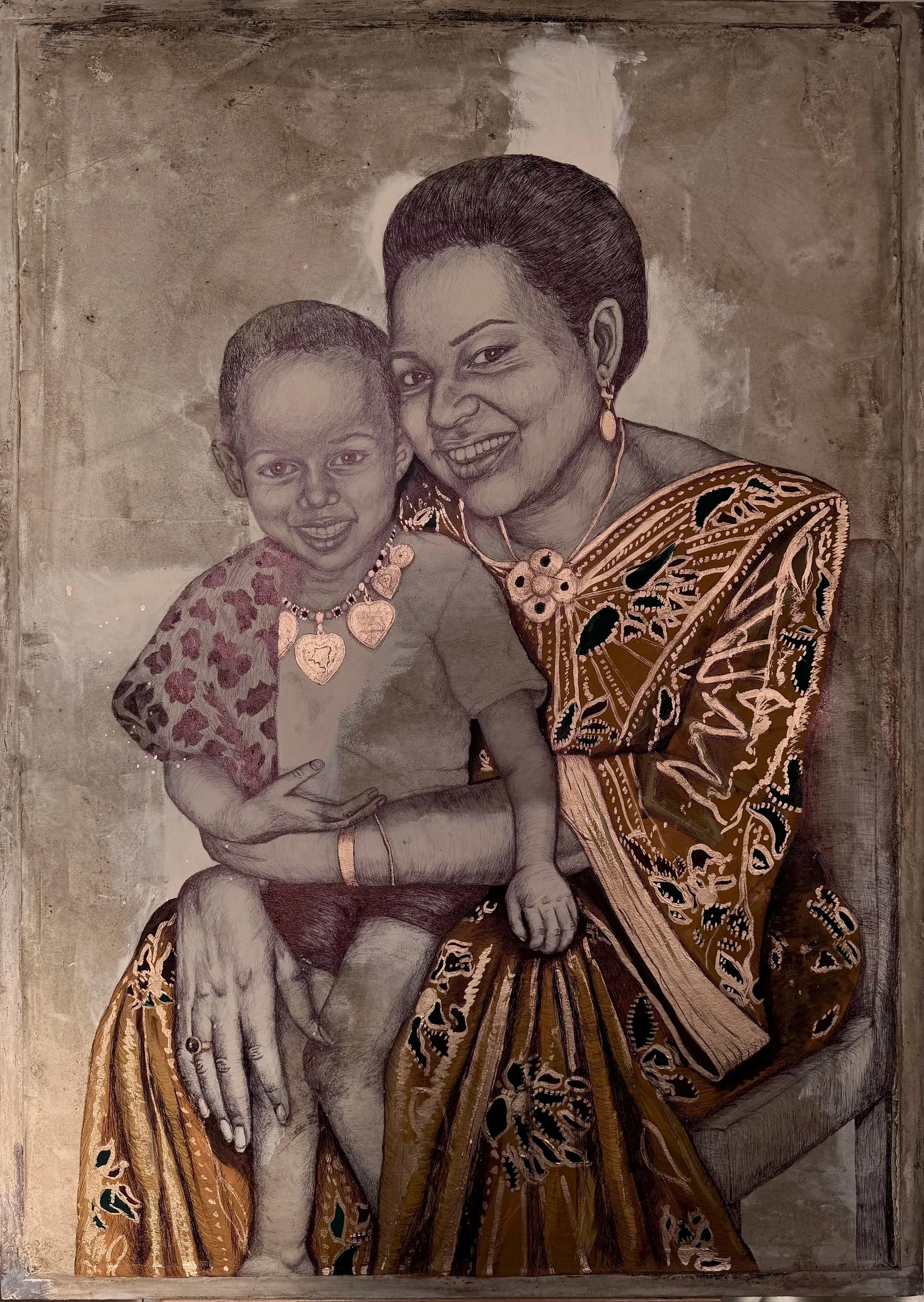 “Mokili Na Ngai Ezali Na Koko” Biro, emulsion, acrylic and gold paint on cement. 87 × 122cm. 2026