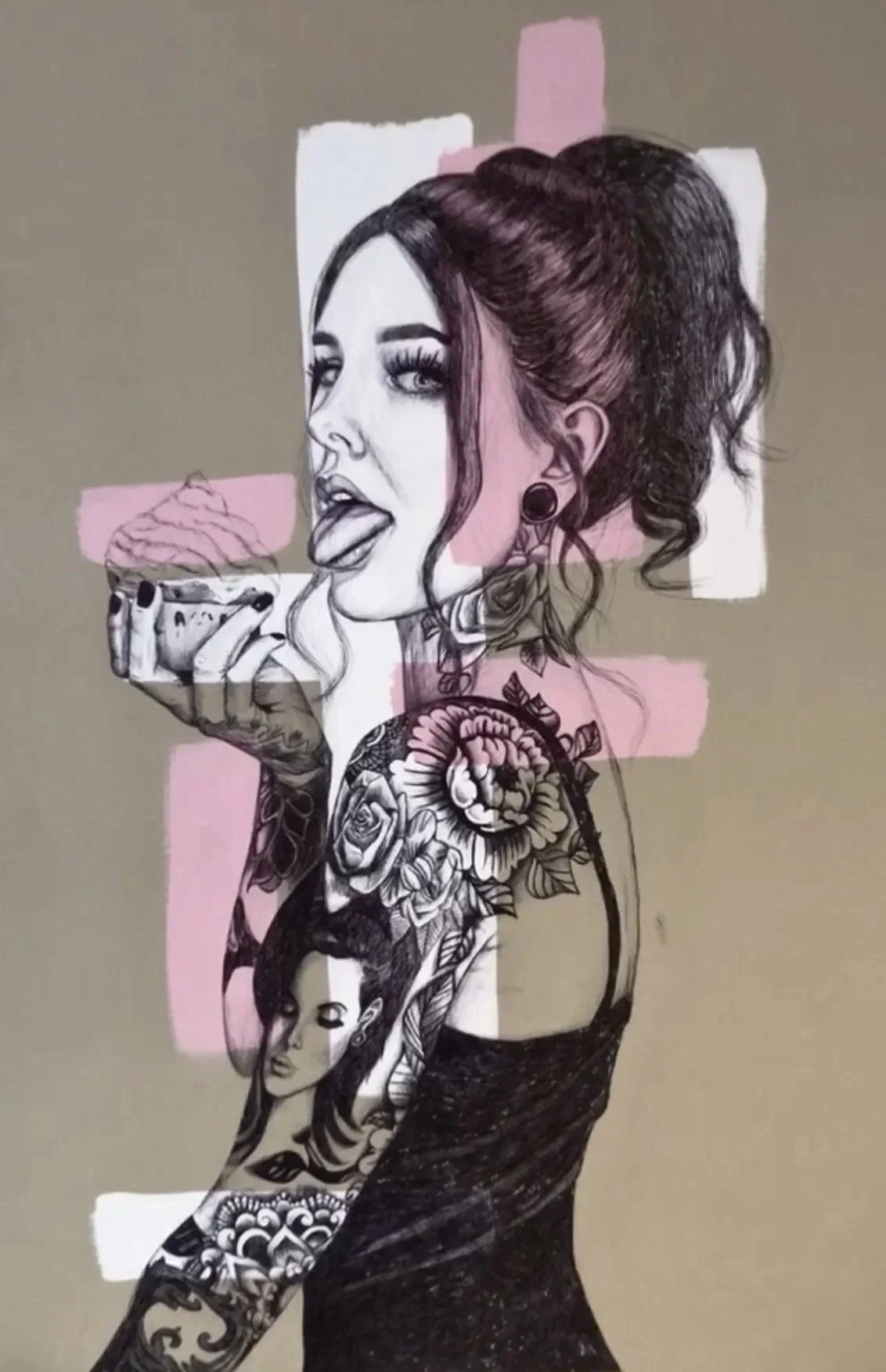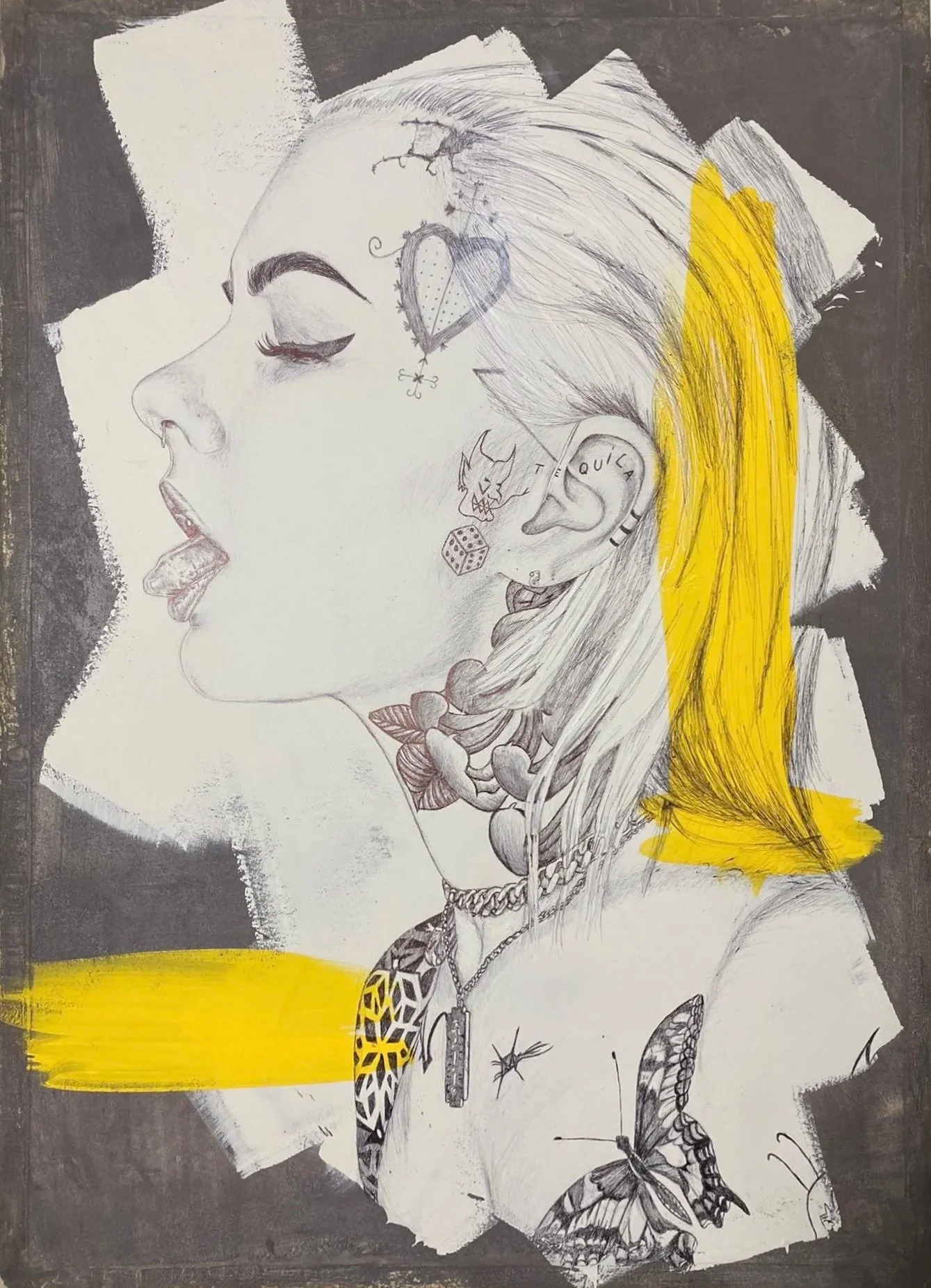 “Carolina 2.0” Biro, spray paint, ink and emulsion on cement. 54 × 82cm. 2023