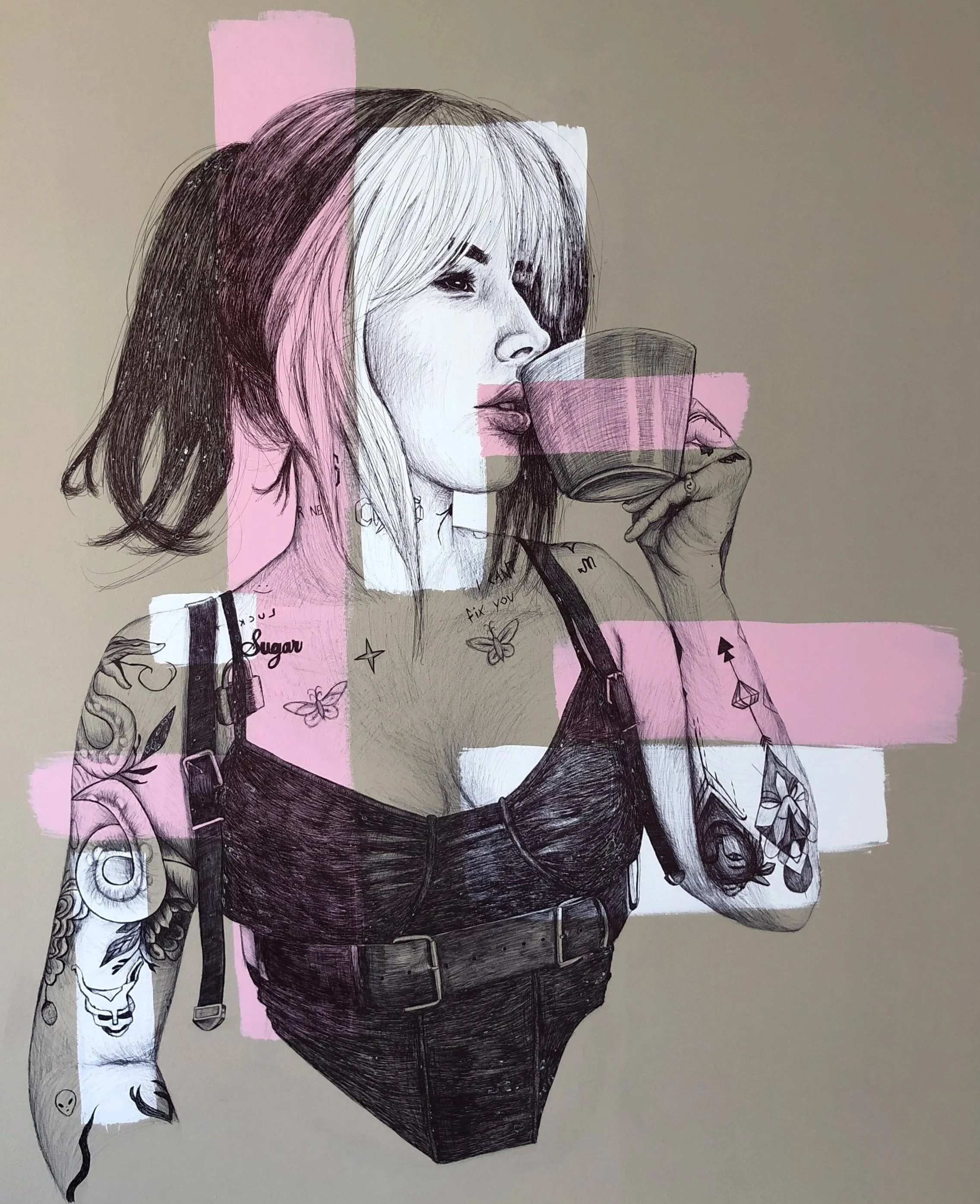 “Confidence” Biro and watercolour on watercolour paper. 42 × 59 cm. 2023