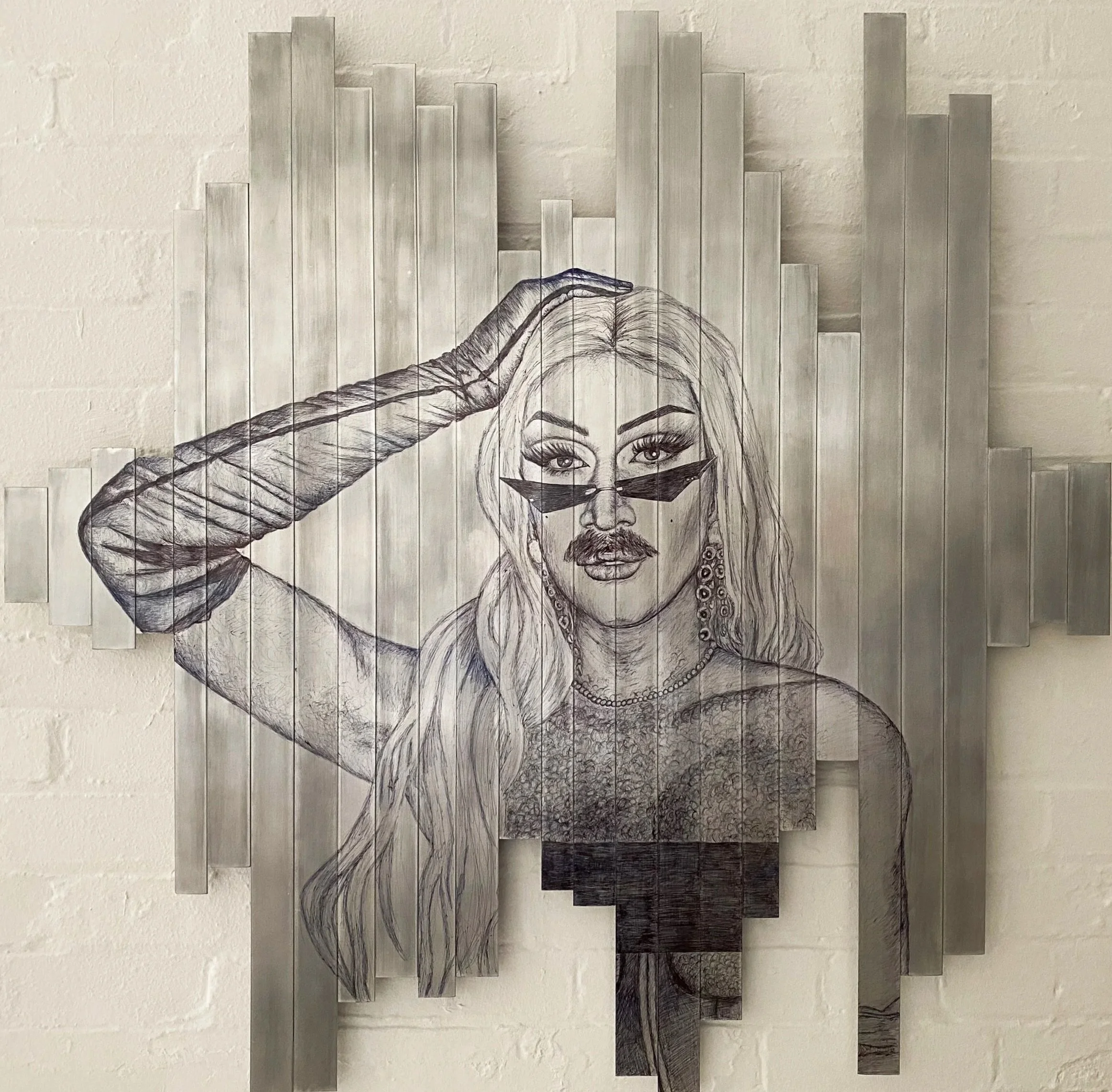 “Salute Banks” Biro and emulsion on metal. 54 × 82cm. 2022